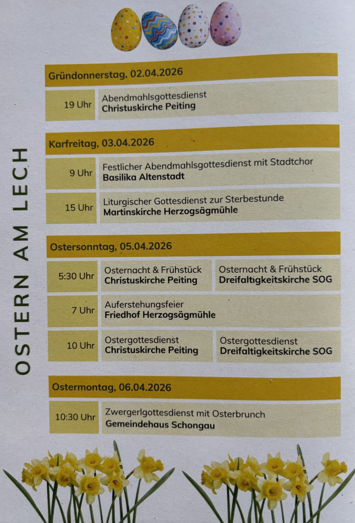 Normalerweise finden die Gottesdienste am Sonntag um 10 Uhr in der Dreifaltigkeitskirche Schongau statt. Am 4. Sonntag im Monat wird im Gottesdienst Abendmahl gefeiert.